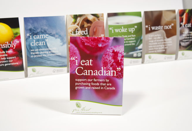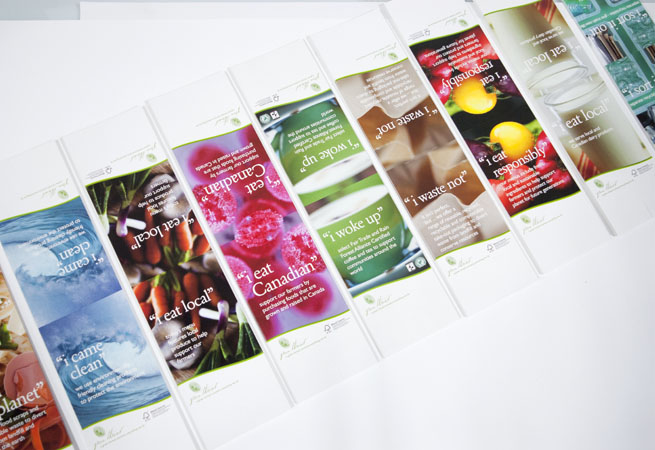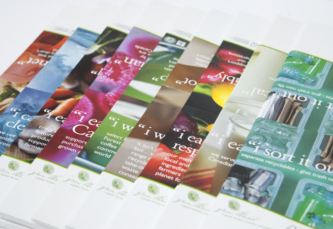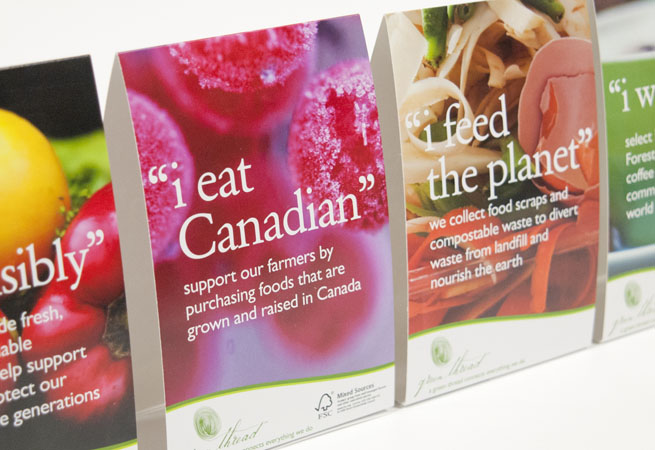 Tent cards were created to place on tables and counters in food service outlets operated by our client. There were ten different tent cards and associated collateral created and managed by Formprint.
